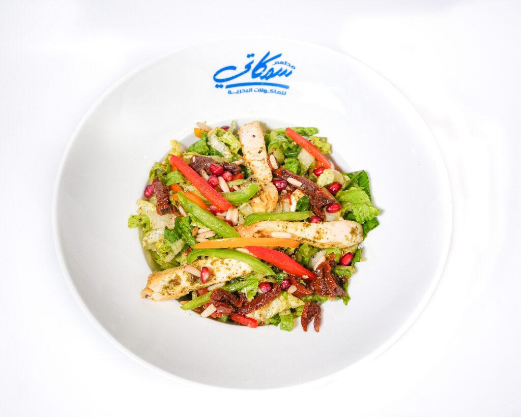 Prepared by the chef, this special salad includes a fresh mix of lettuce, vegetables, and chicken, topped with the chef’s special dressing.